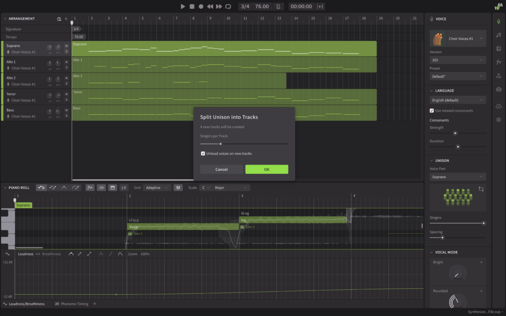 In fact, you can get even more granular with your exporting strategy. Unlike most other virtual choir instruments, Synthesizer V allows you to separate the voices in each choir track into individual tracks. Simply right-click on each track and select the Split Unison into Tracks option. In the window that pops up, you can choose the number of voices you want on each track and unload them all on new tracks.