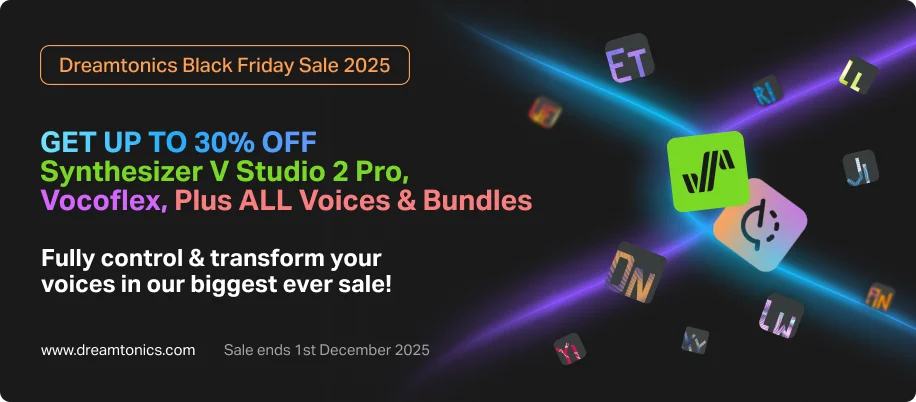 From now until 1st December 2025, you can get 30% off Vocoflex, 25% off ALL Voice Upgrades, 20% off Synthesizer V Studio 2 Pro & Single Synthesizer V Voices, plus up to 15% off Bundle purchases!