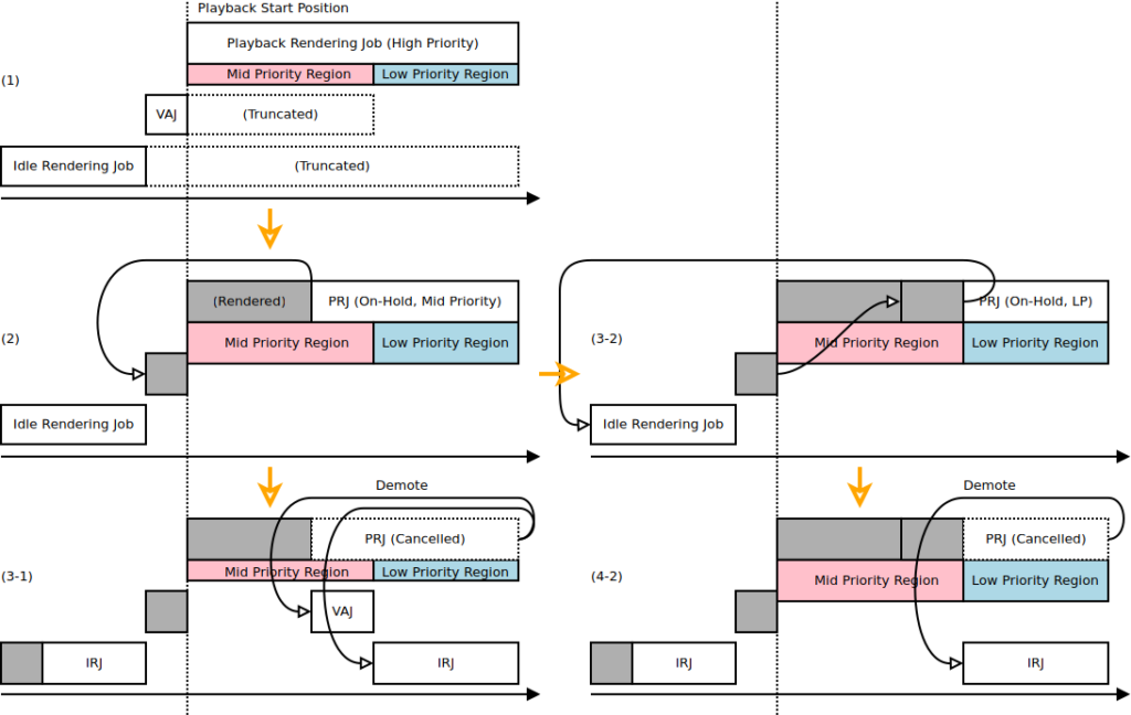 However, behind the scenes it is not quite as simple as it sounds. With each rendering task now capable of using up all CPU cores, careful coordination is required to prevent even a low priority task from interfering with a more urgent task, such as during playback.